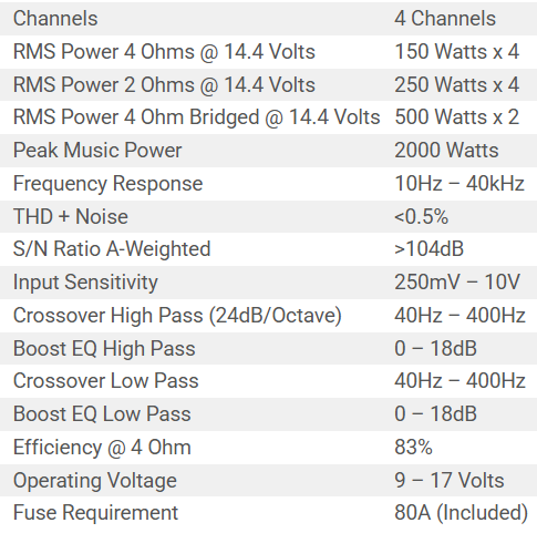 • 4 Ohm Stereo 150 Watts x 4