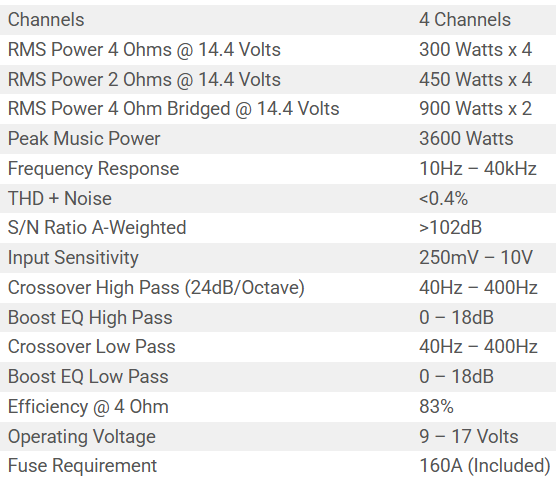 • 4 Ohm Stereo 300 Watts x 4