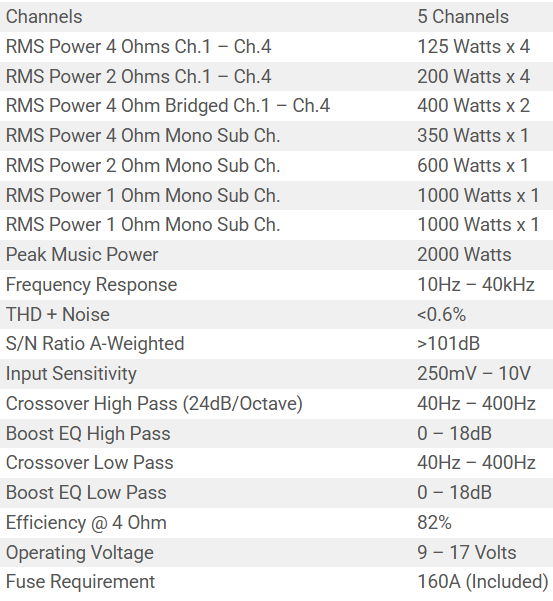 • 4 Ohm Stereo 125 Watts x 4 + 350 Watts x 1 (Sub)