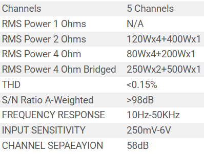 RMS POWER OUTPUT 2 OHM 120Wx4+400Wx1