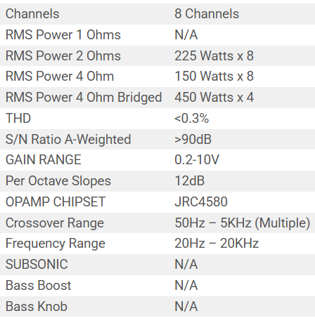 RMS POWER OUTPUT 2 OHM 225Wx8CH