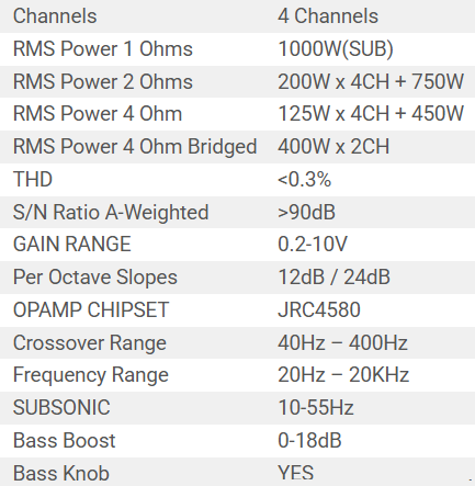 125W x 4 + 450W @ 4 Ohm