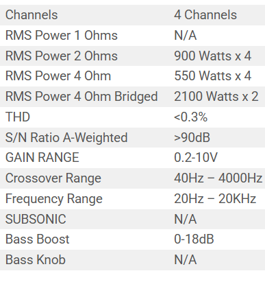 RMS POWER OUTPUT 2 OHM 900W X 4CH